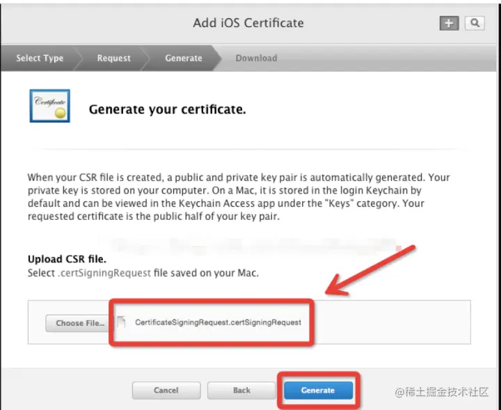 5.** 点击choose File.. 选择创建好的证书请求文件:CertificateSigningRequest.certSigningRequest 文件,点击Generate **