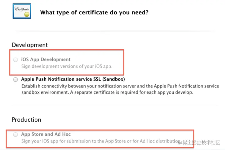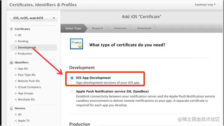 2 、 点击Developement中的iOS App Developement选项**