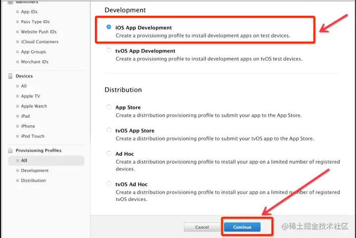 2、** 选择iOS App Developement,点击Continue**