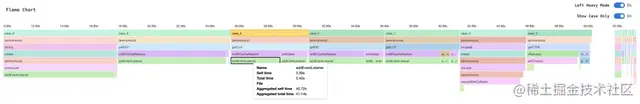 除此之外利用 puppeteer 的能力,我们不仅可以得到 benchmark 的结果,还可以获取到整个 benchmark 过程的 profile 数据,利用 speedscope (github.com/jlfwong/spe…) 绘制出函数执行过程中的火焰图: