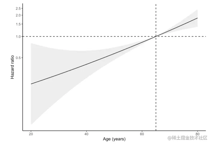 I((age - 65)/10) 0.2814 1.325 0.093 3.024 2.5e-03