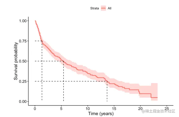 可以从估计的生存曲线导出诸如分位数的集中趋势的度量。