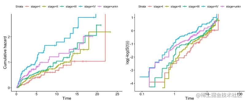 stage=肿瘤的TNM分期(因子):1 =“I”,..., 4 =“IV”,5 =“unkn”