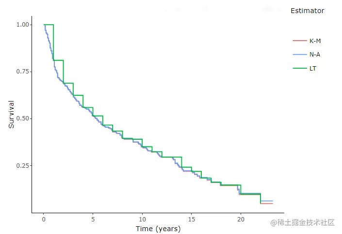 可以绘制不同的生存函数估计值来评估潜在的差异。