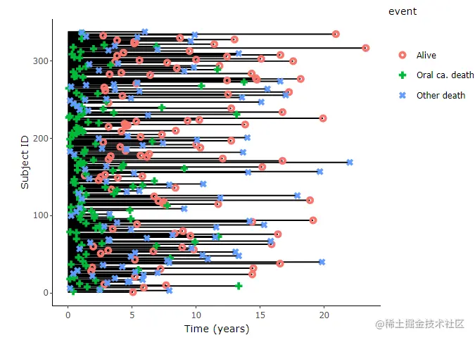 event=结束随访的事件(因子):1 =正常,2 =口腔癌死亡, 3 =其他原因造成的死亡。