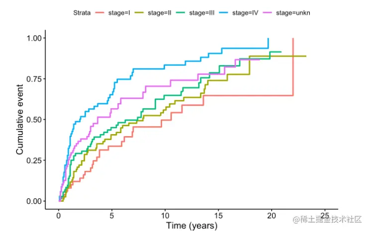 我们可以看到,IV期口腔癌死亡的CIF高于III,甚至更高于I + II。相反,对于其他原因死亡率,曲线似乎不随肿瘤阶段而变化。
