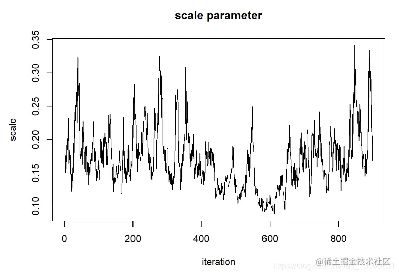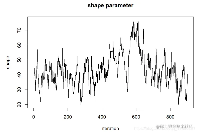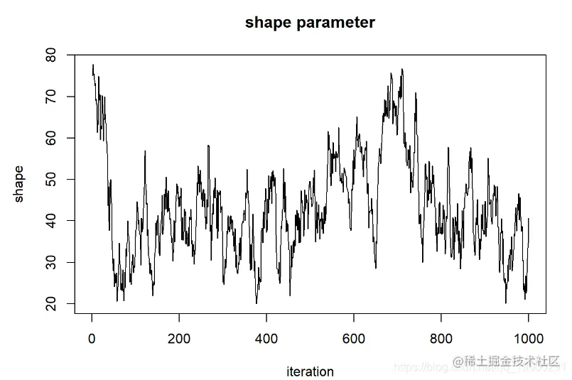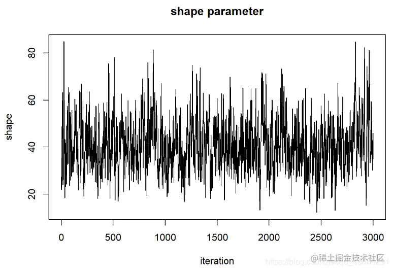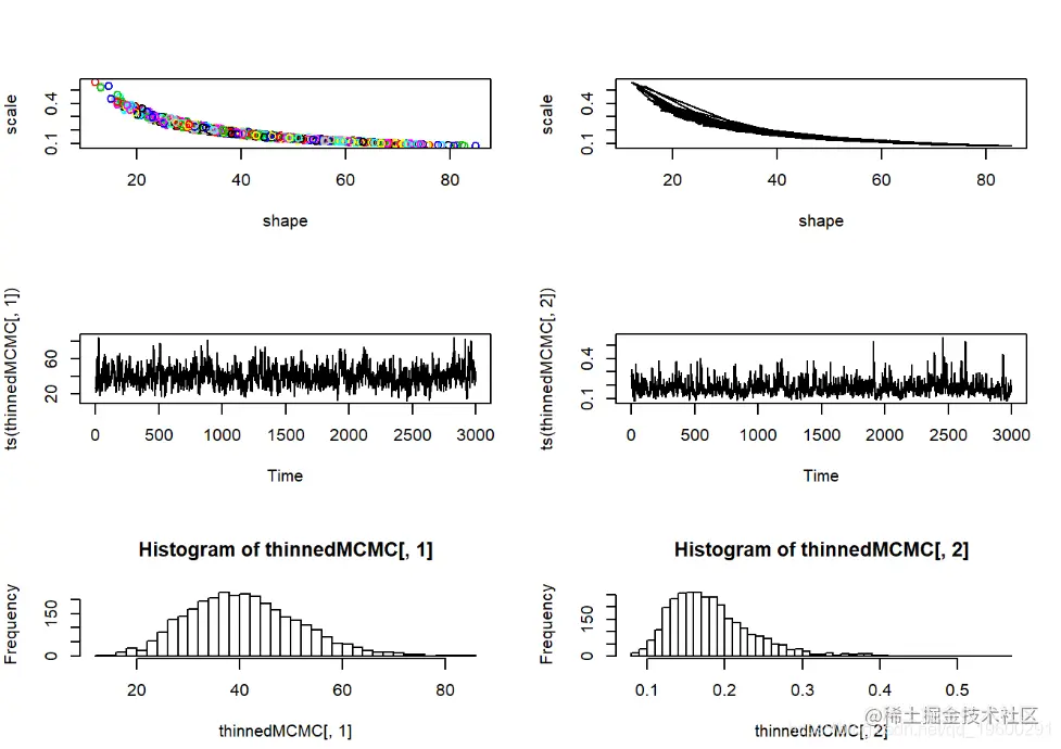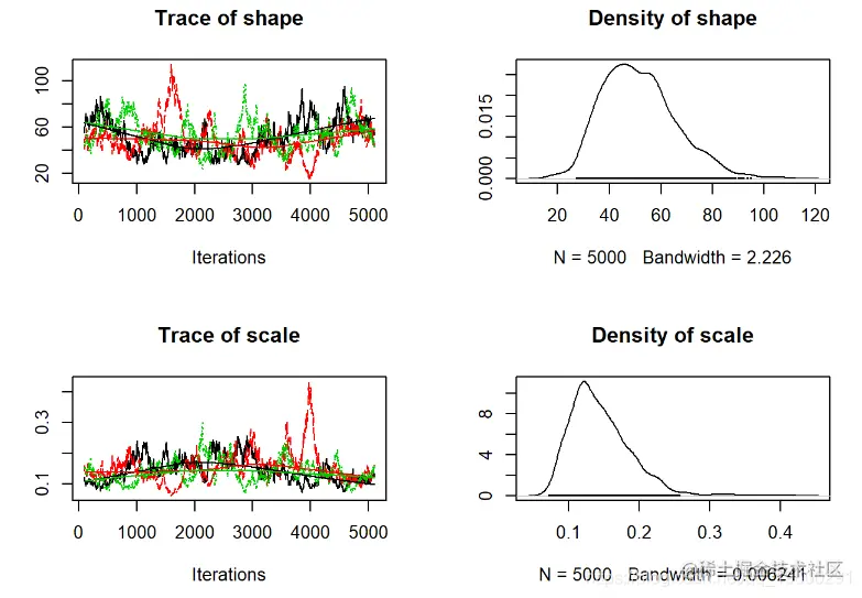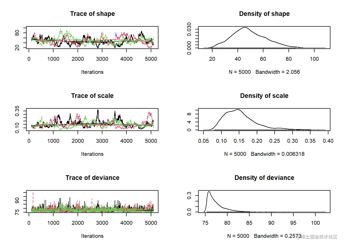- 当视为“轨迹图”时,每个参数的链应看起来像白噪声(模糊的毛毛虫)或类似的噪声