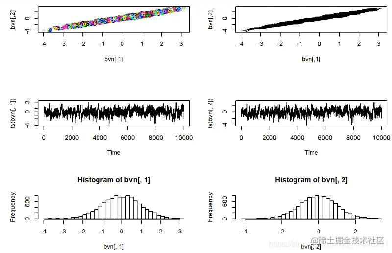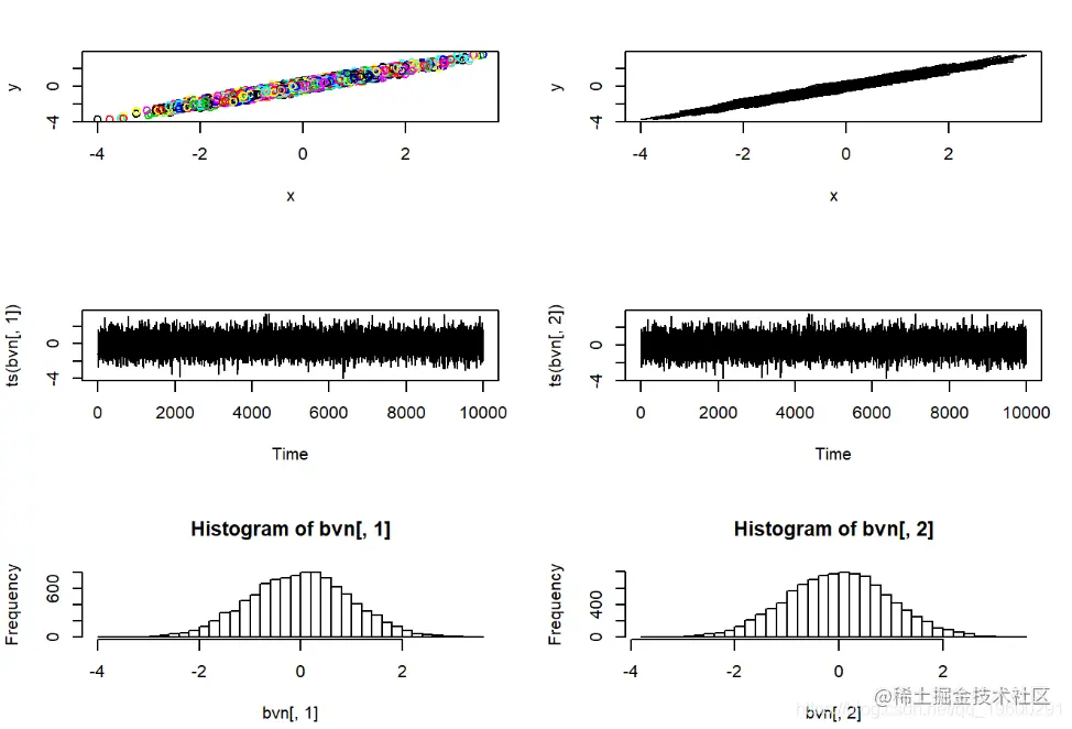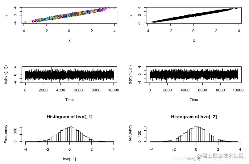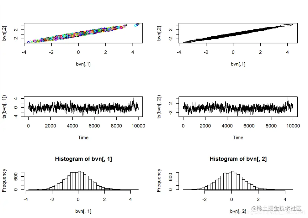 请记住,MCMC采样器只是随机数生成器的一种。我们可以使用Metropolis-Hastings采样器来开发自己的随机数生成器,生成进行简单的已知分布。在此示例中,我们使用MH采样器从标准双变量正态概率分布生成随机数。