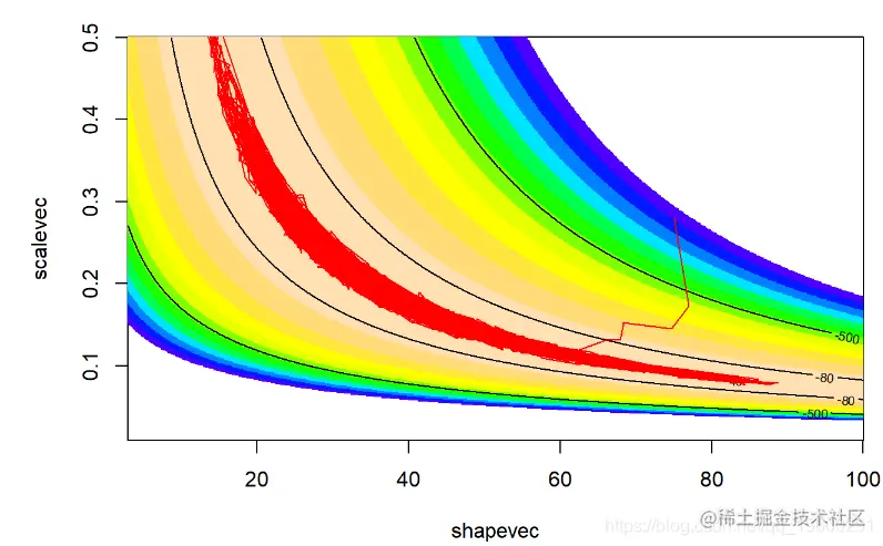 contour(x=shapevec,y=scalevec,z=surface2D,levels=c(-30,-40,-80,-500),add=T)