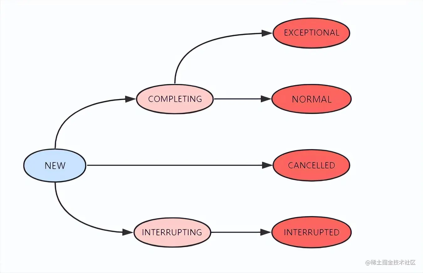 - NORMAL:任务已经执行完成并且任务执行结果已经保存到outcome字段,状态会从COMPLETING转换到NORMAL。这是一个最终态。