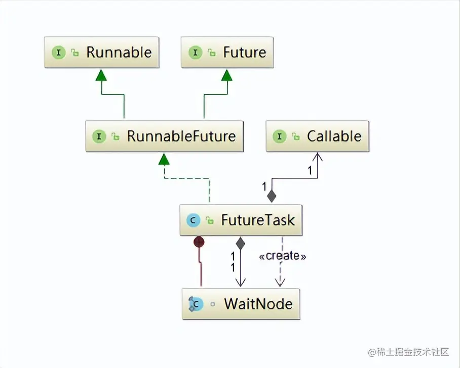可以看到,FutureTask实现了RunnableFuture接口,则RunnableFuture接口继承了Runnable接口和Future接口,所以FutureTask既能当做一个Runnable直接被Thread执行,也能作为Future用来得到Callable的计算结果。