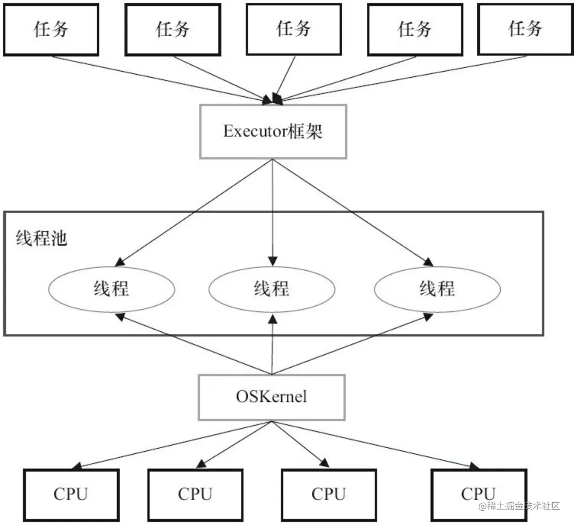 从图中可以看出,应用程序通过Executor框架控制上层的调度;而下层的调度由操作系统内核控制,下层的调度不受应用程序的控制。