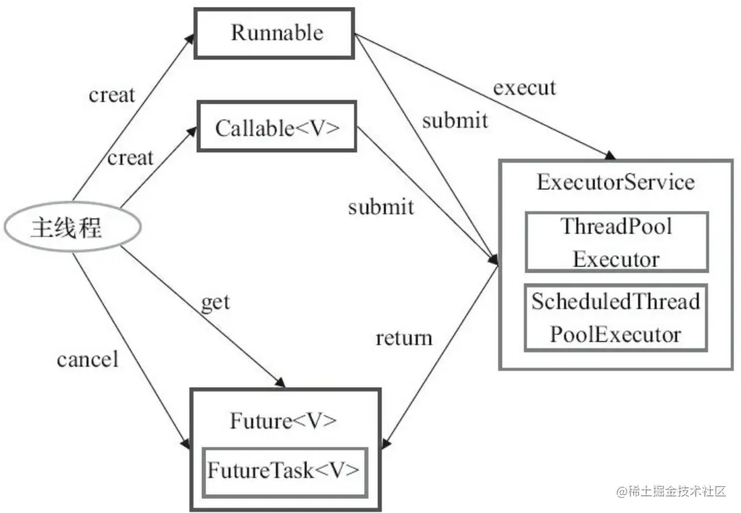 主线程首先要创建实现Runnable或者Callable接口的任务对象。工具类Executors可以把一个Runnable对象封装为一个Callable对象(Executors.callable(Runnable task)或Executors.callable(Runnable task,Object resule))。