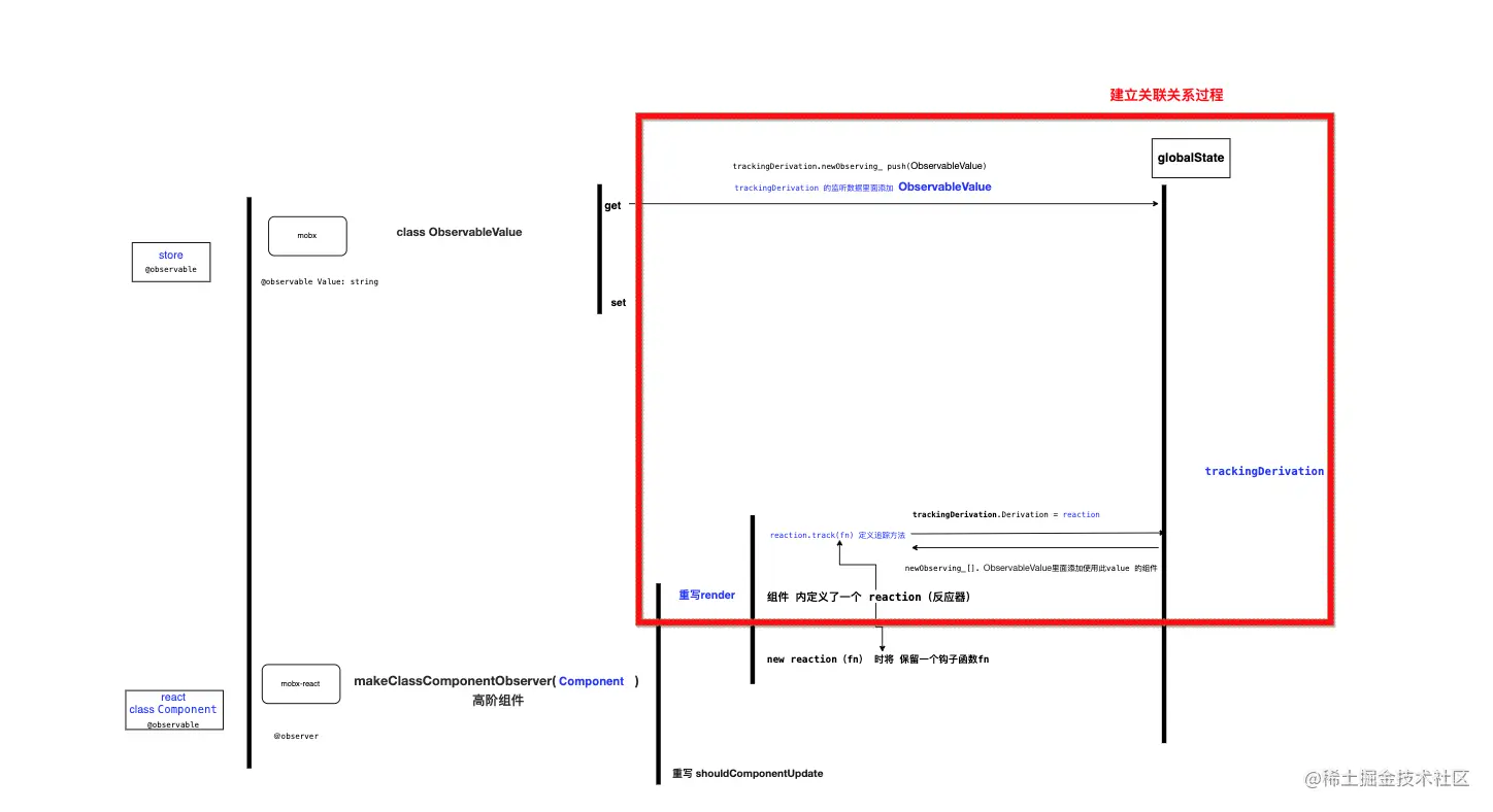 答:通过两个包装器 (@observer,@observable)和一个globalState 建立了联系。 如下图: