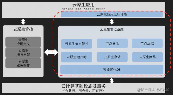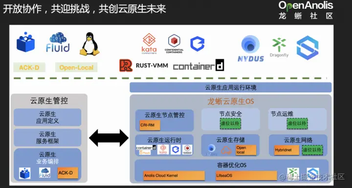 用户界面上移,带给我们哪些挑战和机会?我们可以先整体看看云原生系统的架构。最上层是云原生应用,其中容器场景我们有一层是应用运行环境——容器镜像,函数场景也还好包含语言 runtime。第二层左边是云原生管控,负责应用定义、业务编排、服务框架。右边是我们核心关注的云原生节点系统。里面可以分为云原生节点管控、节点安全、节点运维、云原生运行时,云原生存储,云原生网络,以及底层支撑容器运行的容器优化 OS。最下面的是支撑整体云原生的基础设施服务。接下来我们来看下各个子模块里面的一些具体挑战。