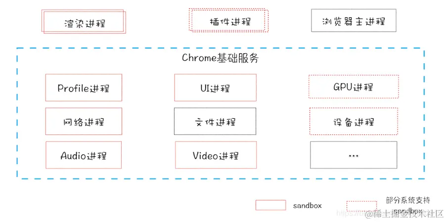 最新的 Chrome 浏览器包括:1 个浏览器(Browser)主进程、1 个 GPU 进程、1 个网络(NetWork)进程、多个渲染进程和多个插件进程。