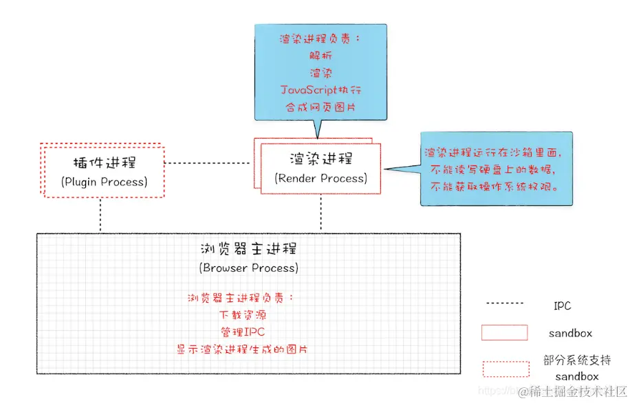 核心任务是将 HTML、CSS 和 JavaScript 转换为用户可以与之交互的网页,排版引擎 Blink 和 JavaScript 引擎 V8 都是运行在该进程中,默认情况下,Chrome 会为每个 Tab 标签创建一个渲染进程。出于安全考虑,渲染进程都是运行在沙箱模式下。