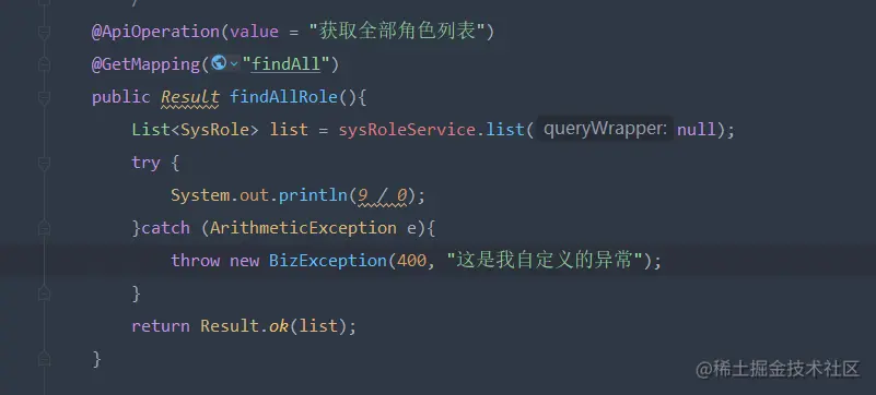 假如在这里即将抛出一个异常,这会被我的异常处理器捕获并直接响应给前端。