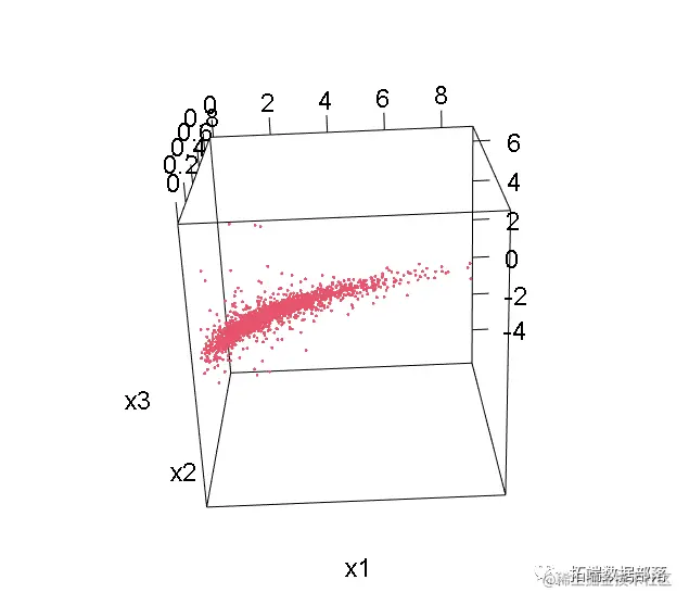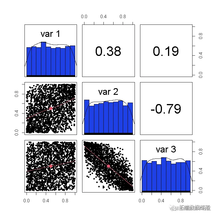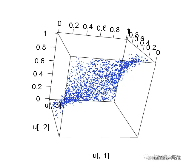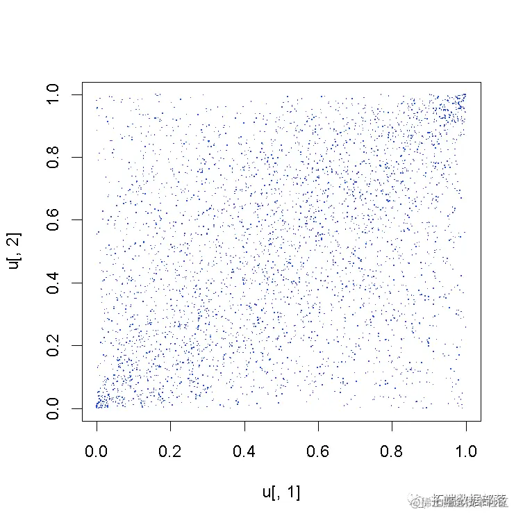 现在我们已经通过copula(普通copula)指定了相依结构并设置了边缘,mvdc()函数生成了所需的分布。然后我们可以使用rmvdc()函数生成随机样本。