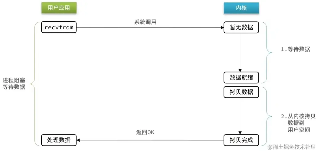 用户去读取数据时,会去先发起 recvform 一个命令,去尝试从内核上加载数据,如果内核没有数据,那么用户就会等待,此时内核会去从硬件上读取数据,内核读取数据之后,会把数据拷贝到用户态,并且返回 ok,整个过程,都是阻塞等待的,这就是阻塞 IO