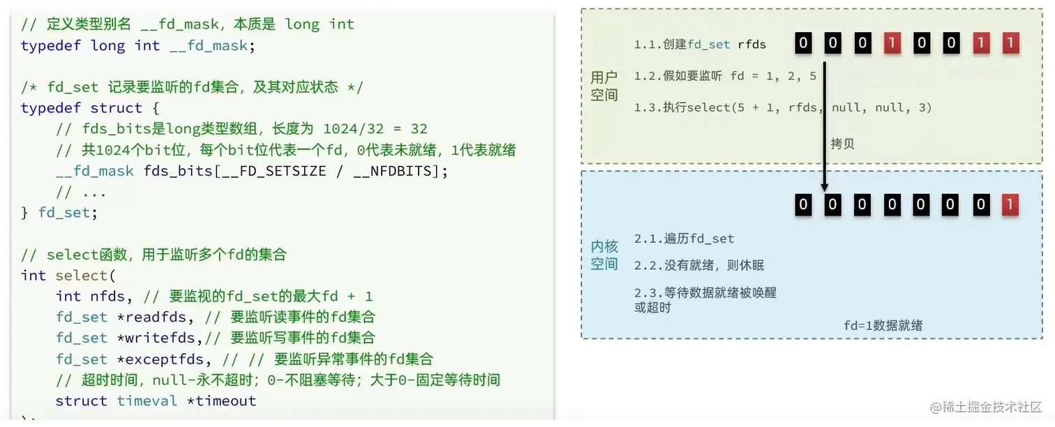 需要进行 2 次「遍历」文件描述符集合,一次是在内核态里,一个次是在用户态里 ,而且还会发生 2 次「拷贝」文件描述符集合,先从用户空间传入内核空间,由内核修改后,再传出到用户空间中。