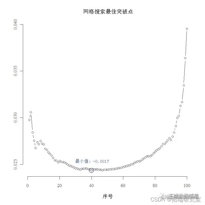 这属于结构性变化的范畴。我考虑沿轴线的点的网格,并建立一个模型,在每个点上有一个断点,断点前有一个斜率,断点后有一个斜率。我寻找整个样本的平方误差之和的最小值,所以我把两个模型的平方误差相加。下图显示了结果。