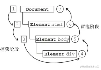 document一直向下传播到目标元素, 依次检查经过的节点是否绑定了事件监听函数,如果有则执行 - 事件处理阶段:事件到达目标元素, 触发目标元素的监听函数