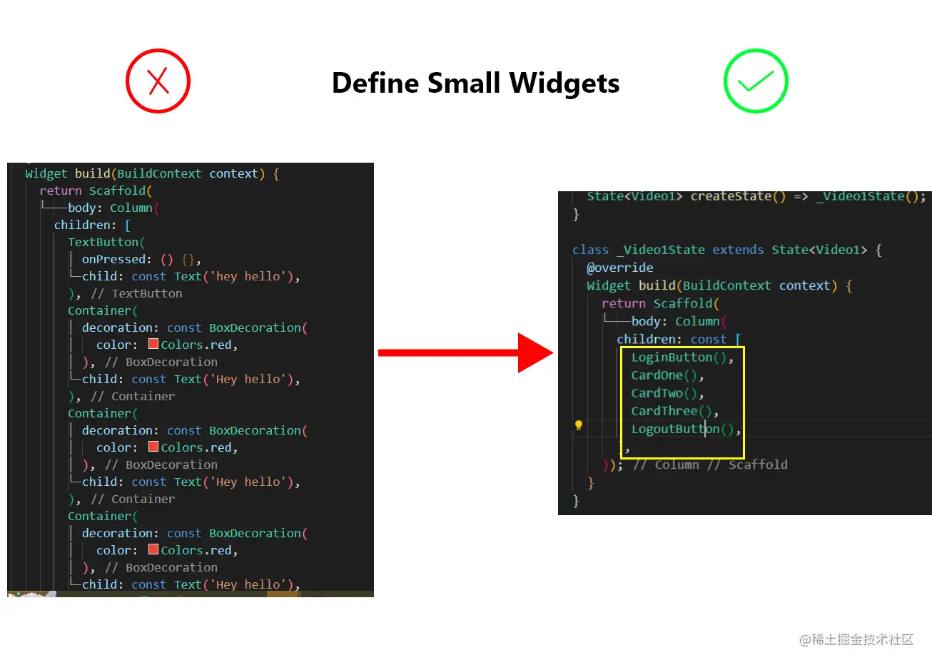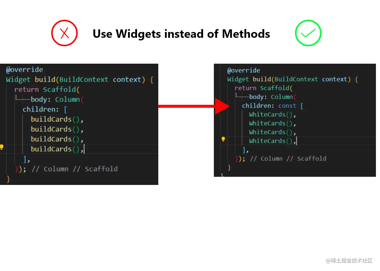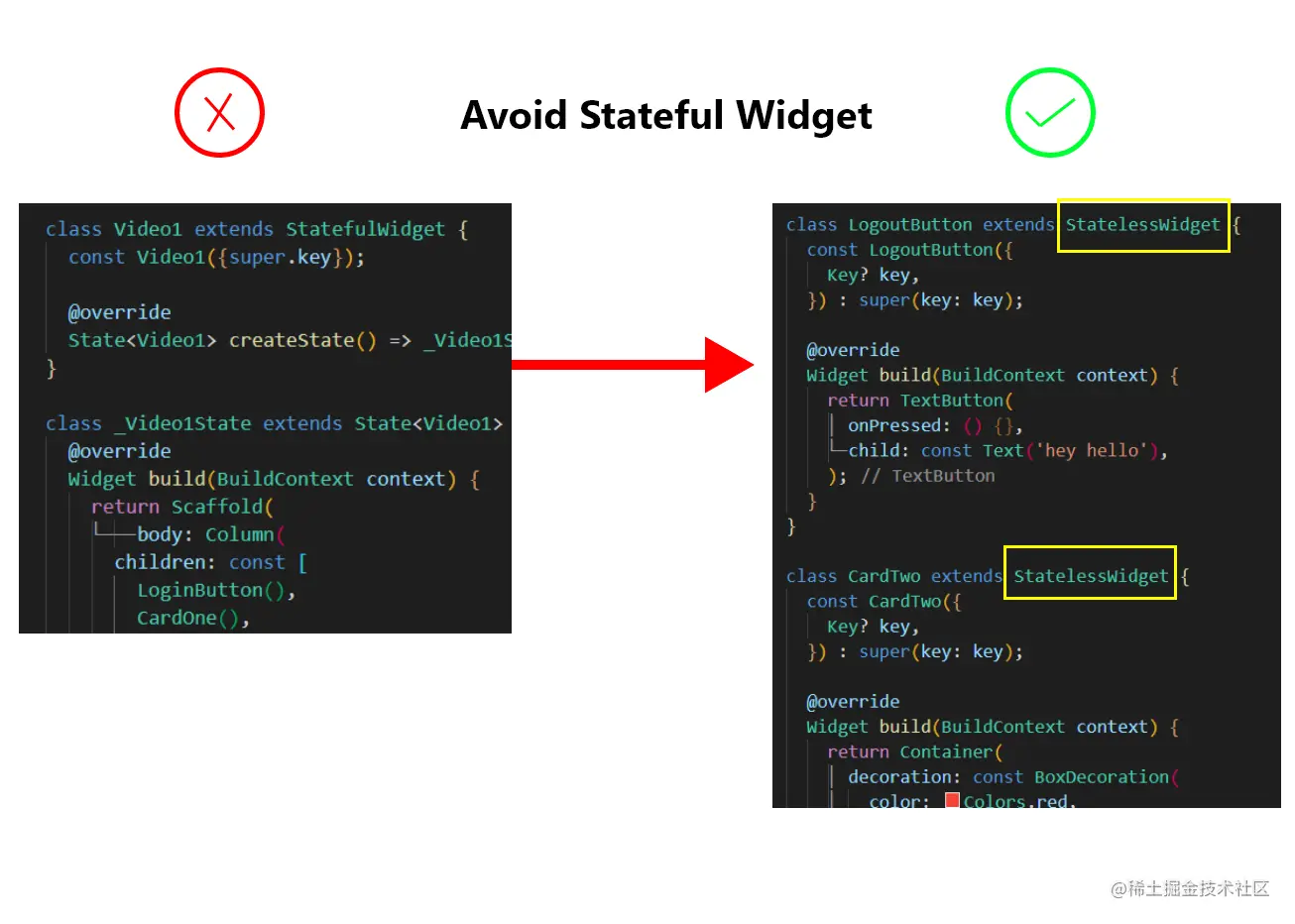 将窗口 widget 提取到一个方法被认为是 Flutter 反模式。为什么?因为当 flutter 重新构建窗口 widget 树时,它会一直一次又一次地调用这些函数,从而为操作节省了更多的处理器时间,而无状态窗口 widget 只会呈现一次,并且不会自动更新,所以在这种情况下使用窗口 widget 而不是方法。