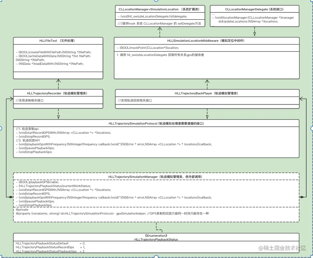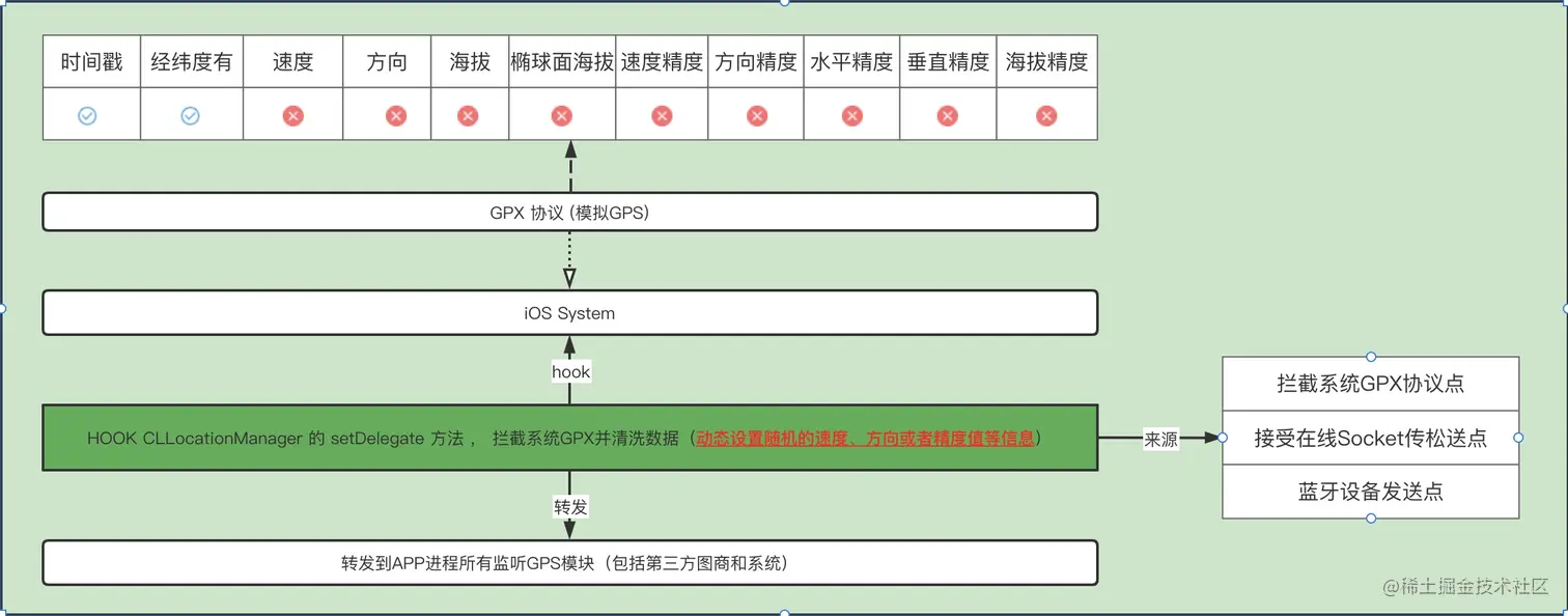 利用这个切入口,我们让中间件在app运行时启动时候hook CLLocationManager 的 设置委托的 方法 ,这样中间件拿到所有关心gps变化的对象,同时把自己作为唯一的接受者,这样达到了数据清洗和分发的作用。