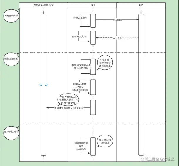 iOS系统可以识别gpx协议,但是gpx协议里只有时间戳和经纬度可以为iOS系统所识别,这样对于我们路测是有缺陷的,因为我们的匹配模块包括高德sdk偏航判断是否需要依赖速度、方向和水平精度等信息确定的,gpx这样的数据系统拿到后返回app的gps监听者都是-1或者0,不能满足我们自测目的,所以就在系统返回的gpx数据的基础之上增加一个中间件去拦截数据然后对匹配模块依赖的数据进行数据清洗;