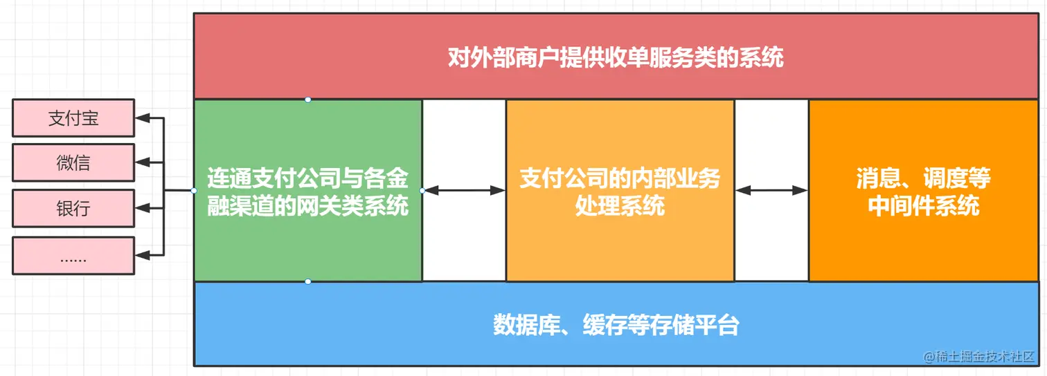 从系统架构层面整体来看,支付公司的系统可以抽象为如下结构: