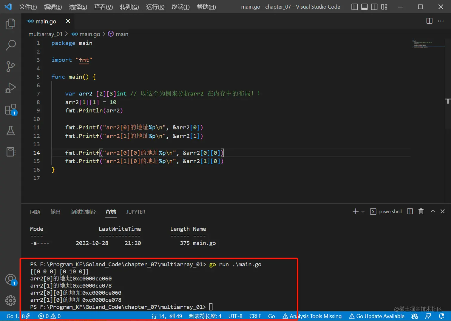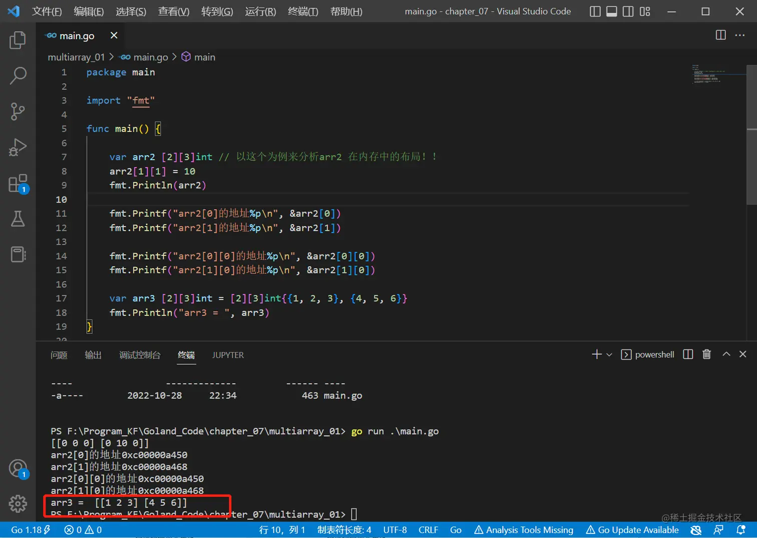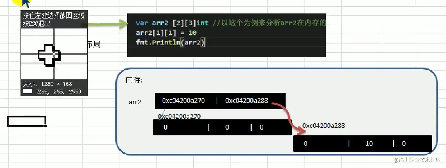 fmt.Printf("arr2[1][0]的地址%p\n", &arr2[1][0])