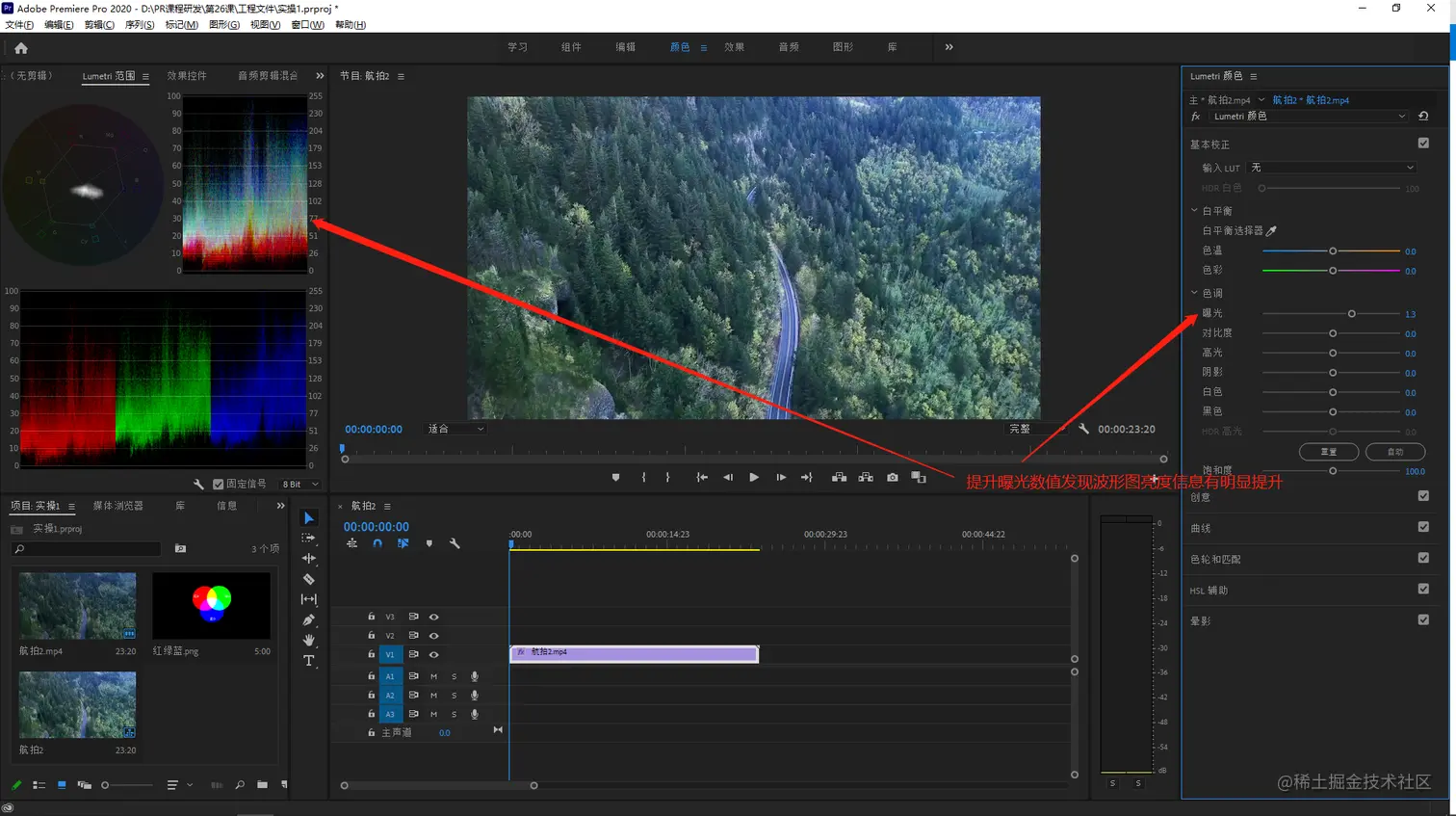 在基本校正面板把曝光数值提升,波形图发生明显的变化