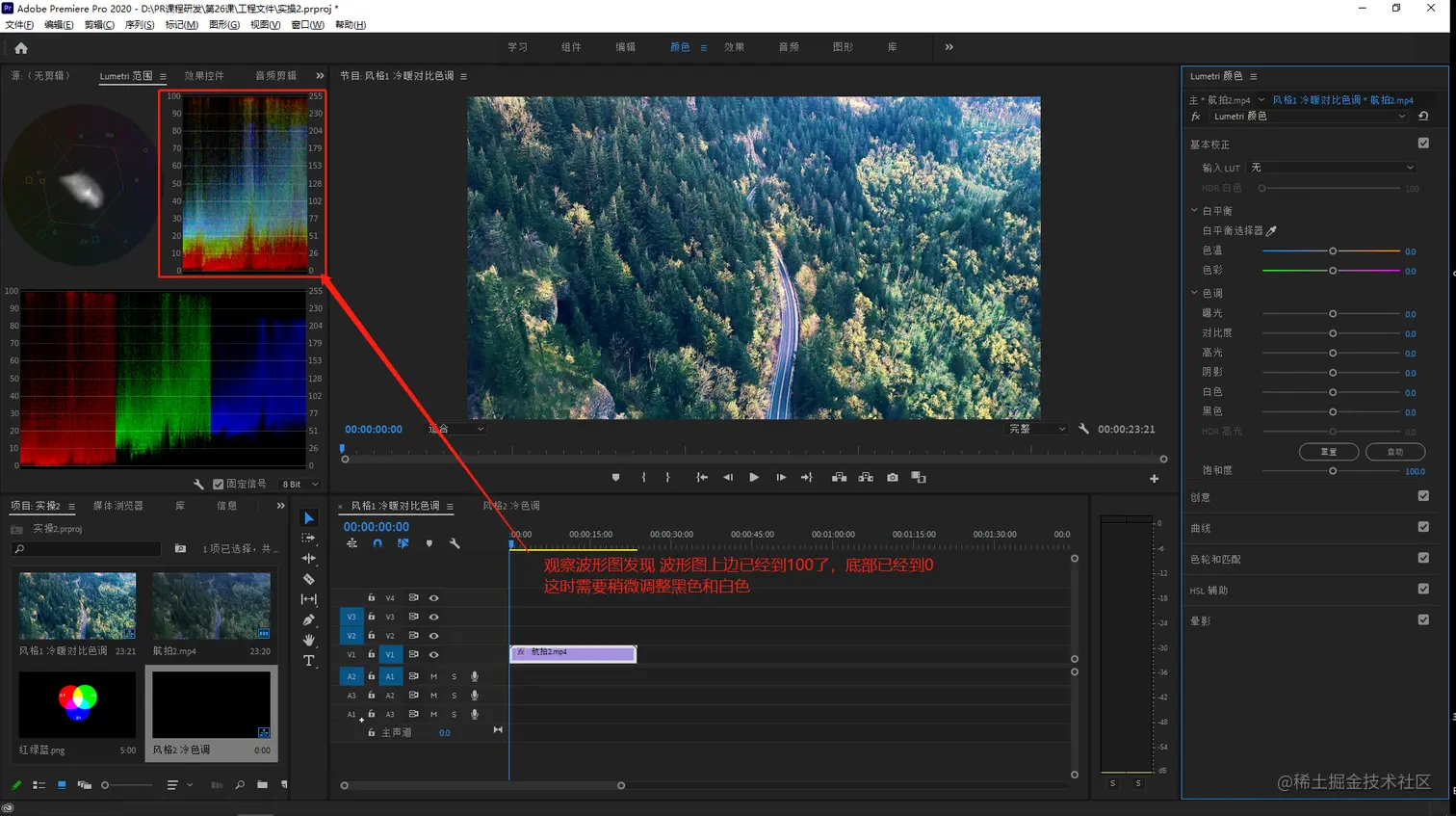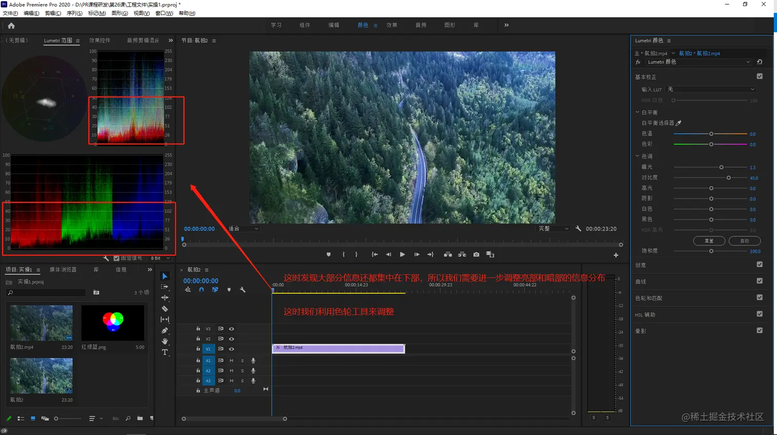 - 但是发现波形图的亮度信息集中在0-40之间,分量图的颜色信息也集中在0-40之间,说明我们在上一步调整对比度还不够强烈。这时我们需要切换到色轮工具再进行对比度的调整
