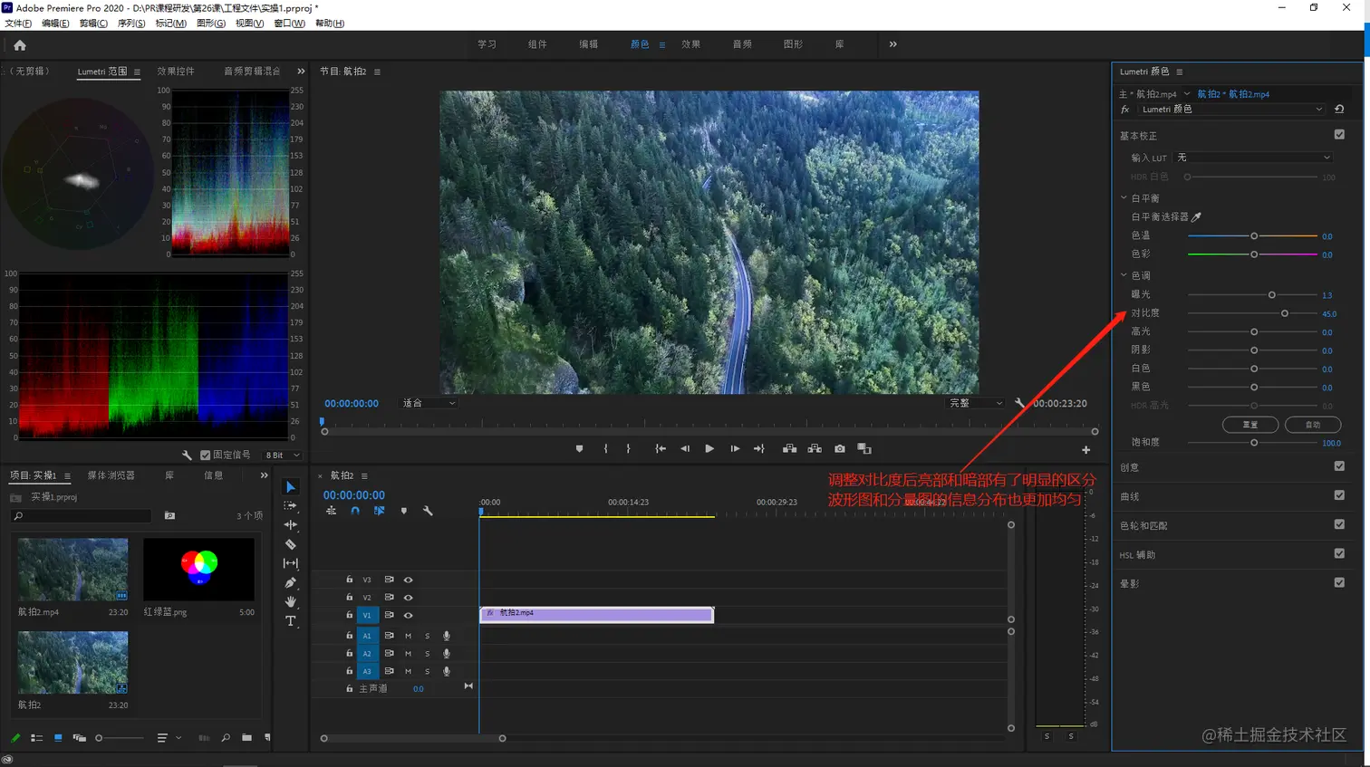 - 调整完曝光后发现波形图和分量图的大部分信息都集中在暗部,说明对比度不够,这时需要提升对比度