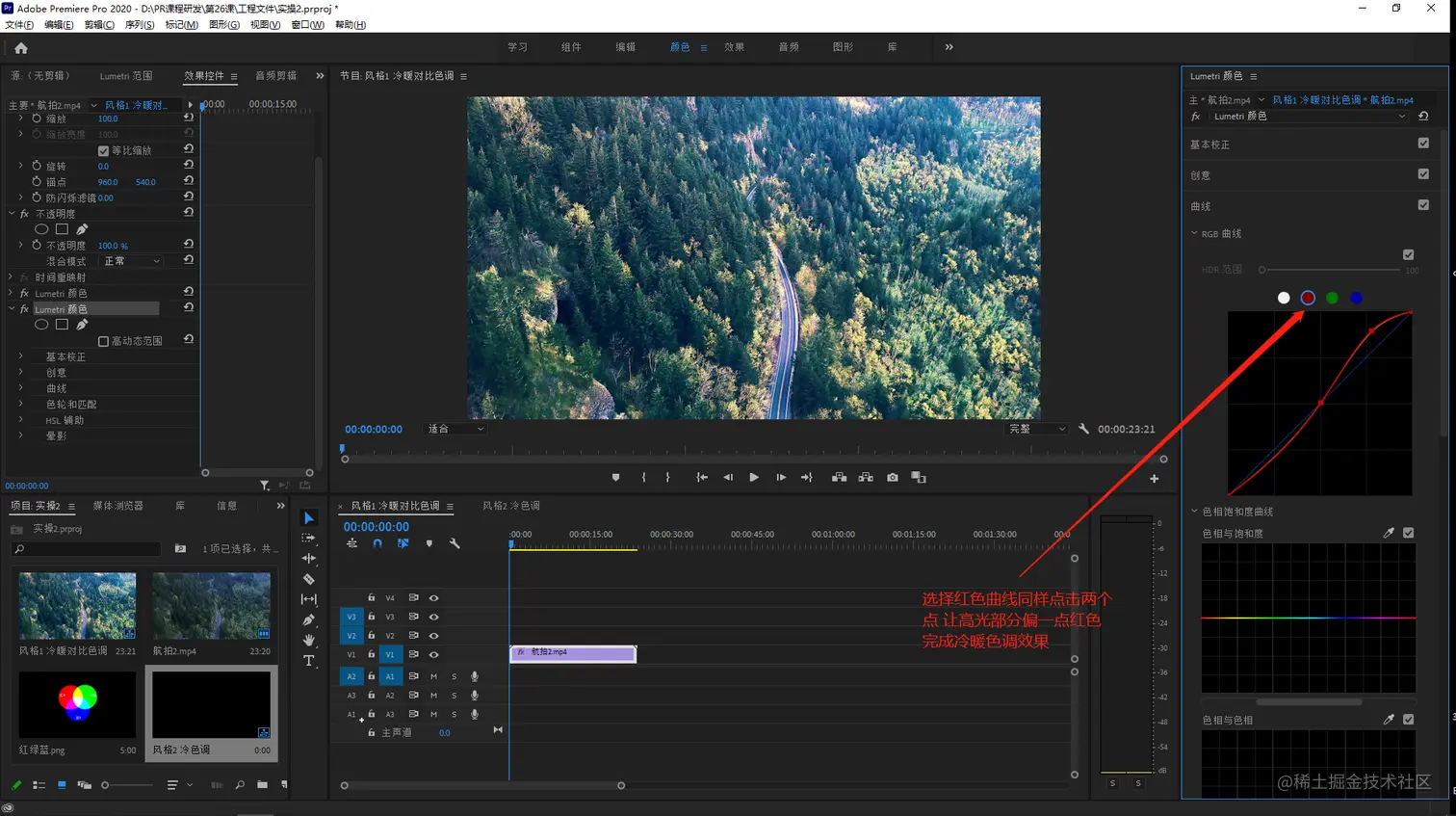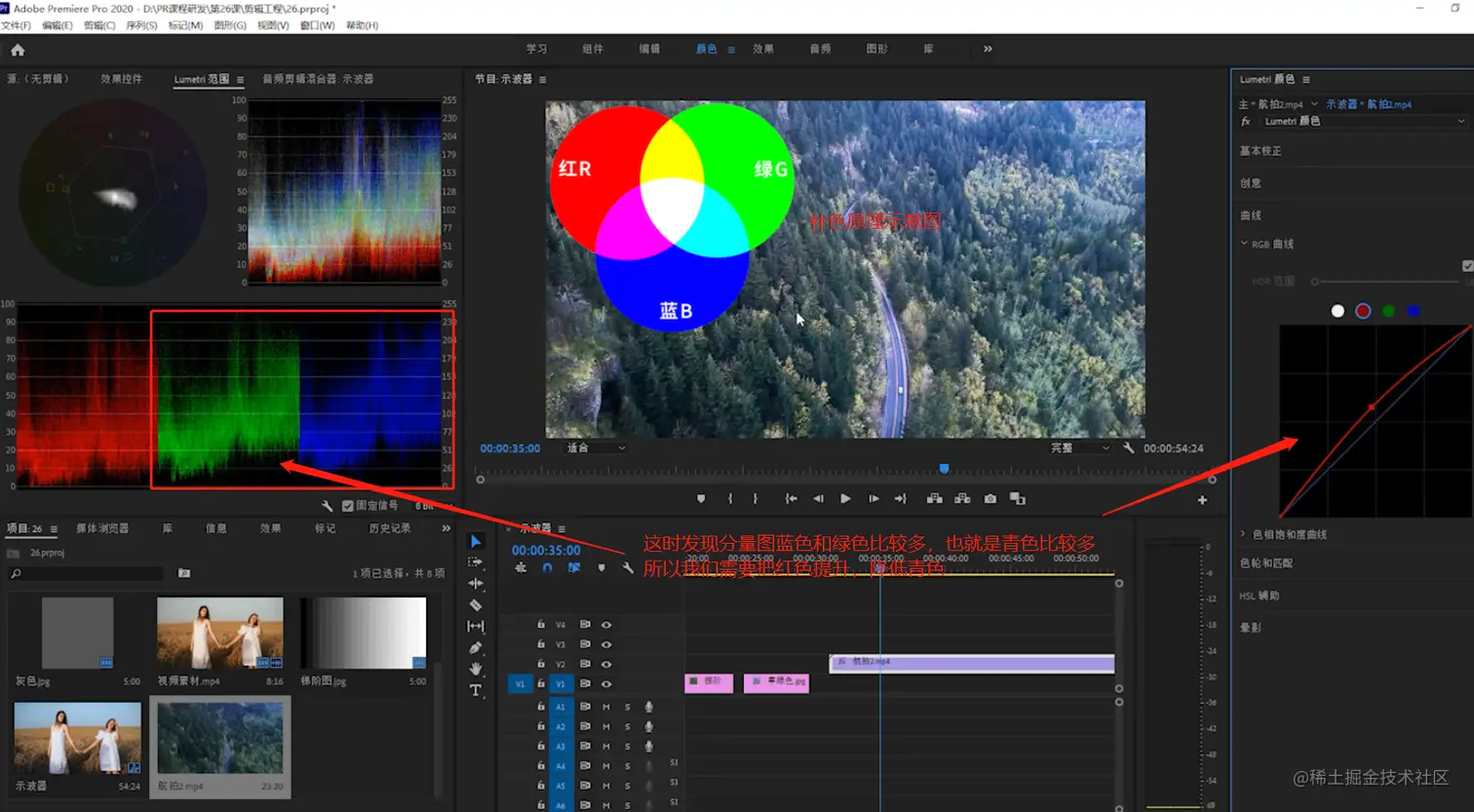 - 这时发现分量图上蓝色和滤色稍微多一点,根据补色原理,需要把红色提升一点,找到曲线下的红色曲线,将曲线向上拖动一点,完成一级调色。