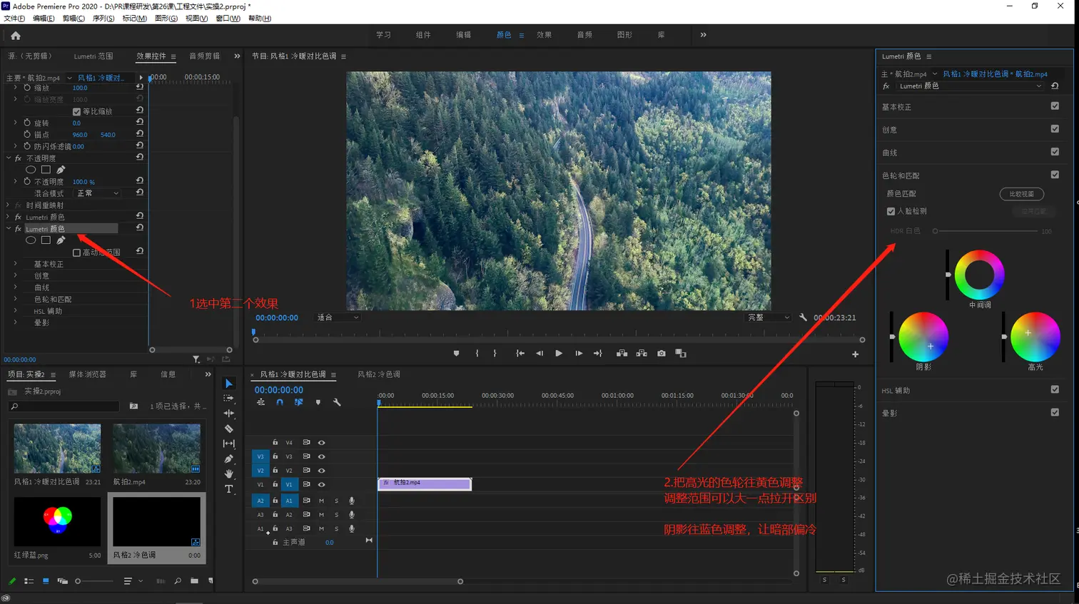 - 选中第二个lumetri颜色效果,找到色轮面板,把高光往黄色调整,阴影往蓝色调整,拖动颜色时可以大幅度拖动,先把冷暖色调的对比调出来