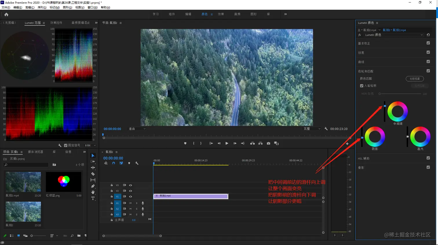 把色轮中间调前的滑杆向上拖动,提高整个画面的亮度,把阴影前的滑杆向下拖动让阴影部分更暗
