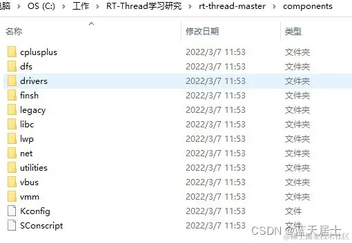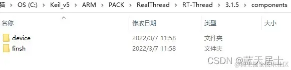 在RT-Thread看来,除了内核,其它由第三方添加的软件都是组件,比如gui、fatfs、lwip和finsh等。这些组件就存放在components文件夹下。Nano版本只存放了finsh和device,其它的都被删除了。如下图所示: