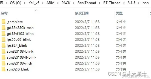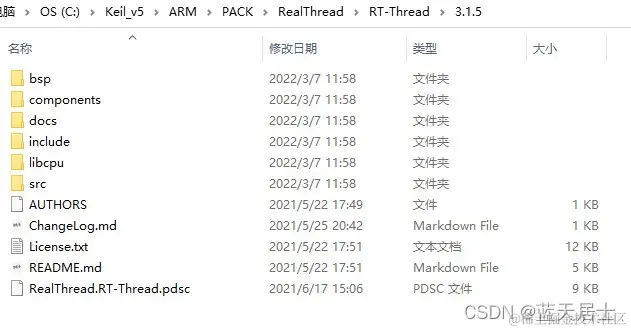 点击上图中的下载按钮,成功下载后将得到名称为“RealThread.RT-Thread.3.1.5.pack”的安装文件(文件名根据不同版本会有所不同,笔者下载的是这个名称)。双击此安装包,安装成功之后,可以在KEIL安装路径的PACK目录下找到刚刚安装的Package的所有文件,如下图所示: