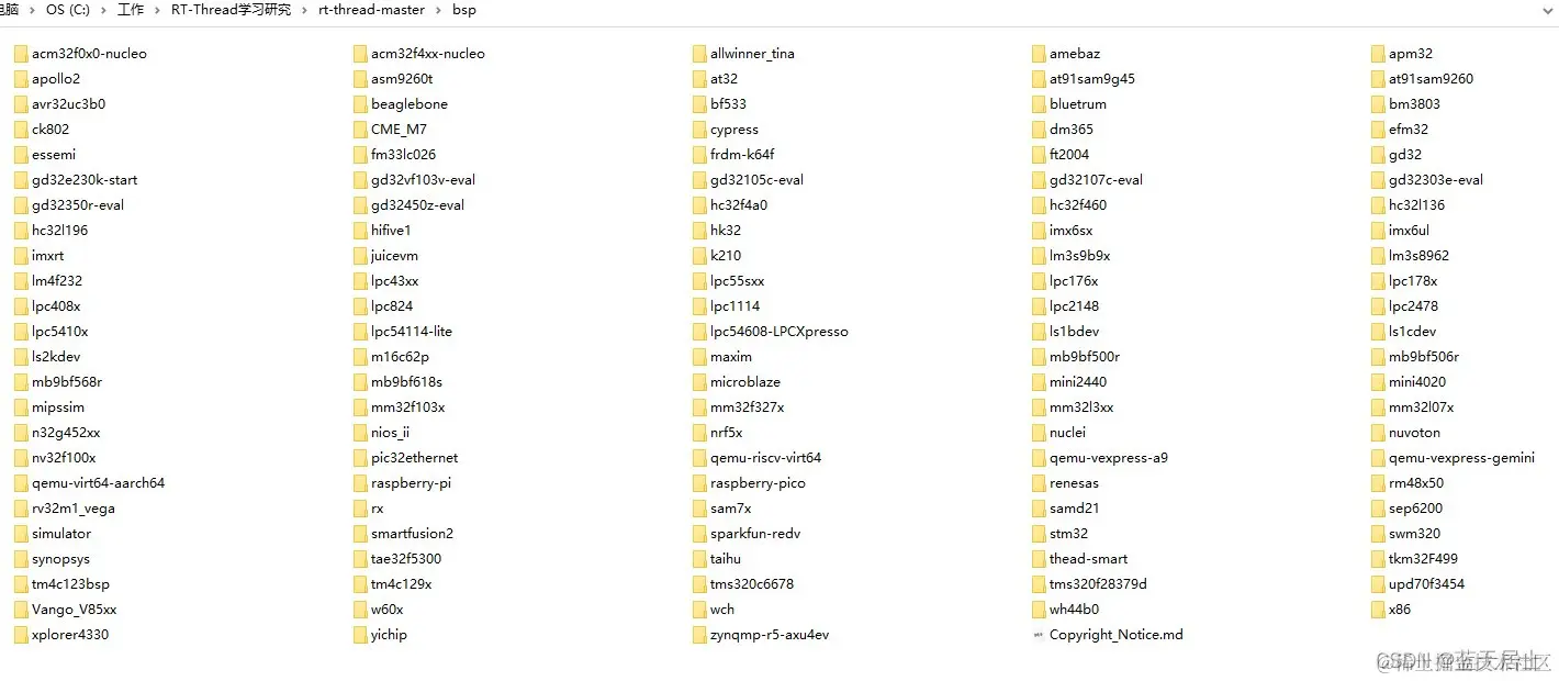 bsp(board support package)文件夹中存放的是板级支持包。RT-Thread为了推广自己,会给各种半导体厂商的评估板写好驱动程序,这些驱动程序就存放在这个bsp目录下。Nano版本只有少量几款开发板的驱动,如下图所示: