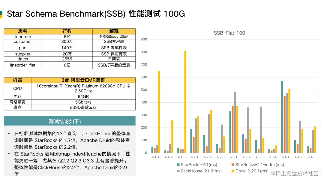 在 SSB 的性能测试方面,我们也构建了三个阿里云EMR 集群来做性能对比,测试结果如下: