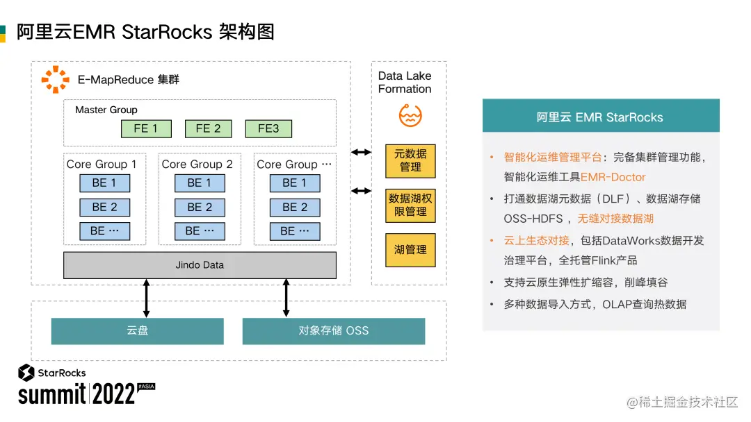 与阿里已有的存算分离产品进行了高度的技术融合,例如数据湖构建 DLF、Jindo FS、Jindo Data 和 OSS 等。实现智能化的运维管理平台,完备集群管理功能,利用智能化的运维工具及时诊断数据湖和 StarRocks 的一些运维和使用问题。