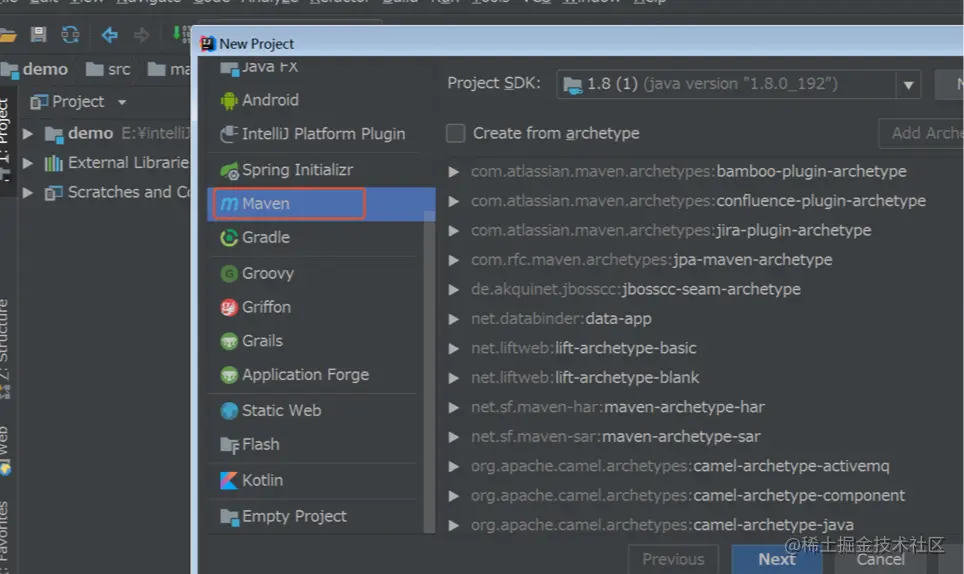 然后选择Maven构建,这里注意不要勾选create from archytype,虽然它会帮你创建项目骨架,但是会从网络中下载一些东西,过程可能比较慢,有可能会卡住。
