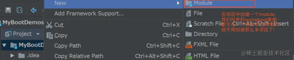 为了方便我们以后讲述其他SpringBoot知识点,这里我首先创建一个SpringBoot项目,然后在这个项目中创建多个module,每个module讲述一个SpringBoot的知识点,这样我们就不用建立多个intelliJ项目了。