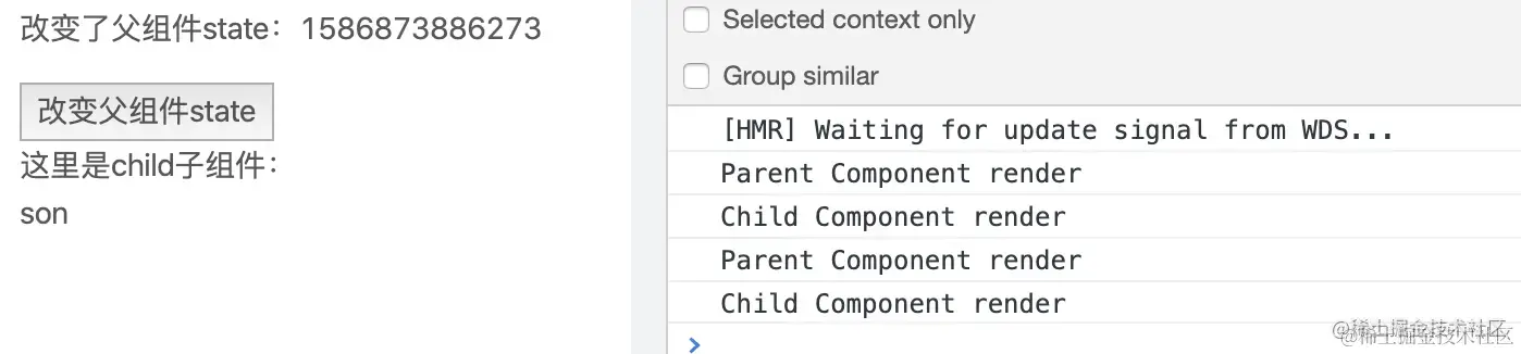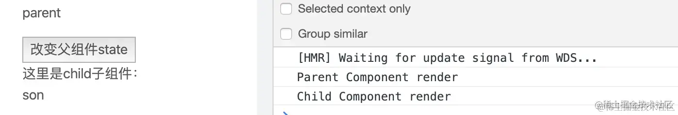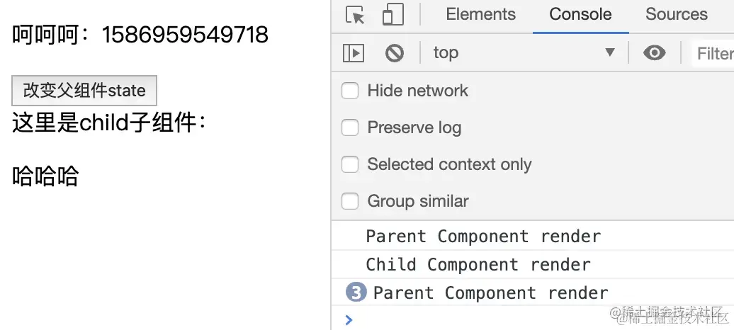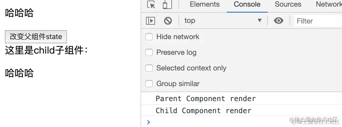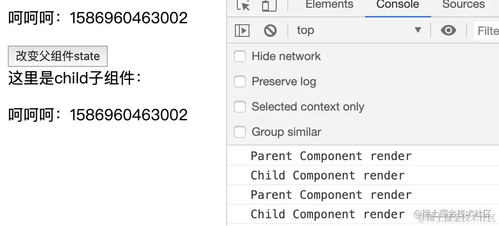 Parent Component render和Child Component render。点击按钮,我们会发现又输出了一遍