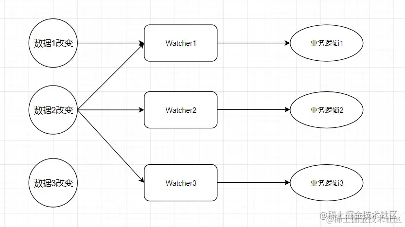 每个watcher和数据之间的关系要么是1对1,要么是多对多关系(这与watcher的类型有关),要不是没有联系。watcher和业务逻辑只有1对1关系。