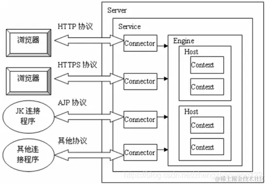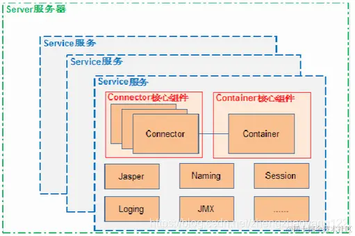 一个 Tomcat 中只有一个 Server,一个 Server 可以包含多个 Service,一个 Service 只有一个 Container,但是可以有多个Connectors,这是因为一个服务可以有多个连接,如同时提供 Http 和 Https链接,也可以提供向相同协议不同端口的连接,示意图如下(Engine、Host、Context下边会说到):