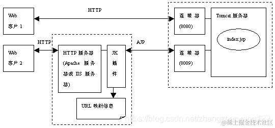 第二个配置 Connector,客户端可以通过 8009端口使用 AJP协议访问 Tomcat。AJP协议负责和其他的Http服务器(如Apache)建立连接;在把 Tomcat与其他服务器集成时,就需要用到这个连接器,之所以使用 Tomcat和其他服务器集成,是因为 Tomcat可以用作 Servlet/JSP容器,但是对静态资源处理速度较慢,不如 Apache和 IIS等 HTTP服务器;因此常常将 Tomcat和 Apache等集成,前者做 Servlet容器,后者处理静态资源,而 AJP协议便负责 Tomcat与 Apache的连接。Tomcat 和 Apache等集成的原理如下图: