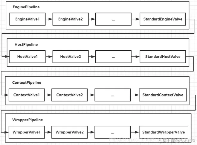我们知道 Container包含四个子容器,而这四个子容器对应的 BaseValve分别在:StandardEngineValve、StandardHostValve、StandardContextValve、StandardWrapperValve。Pipeline的处理流程图如下:
